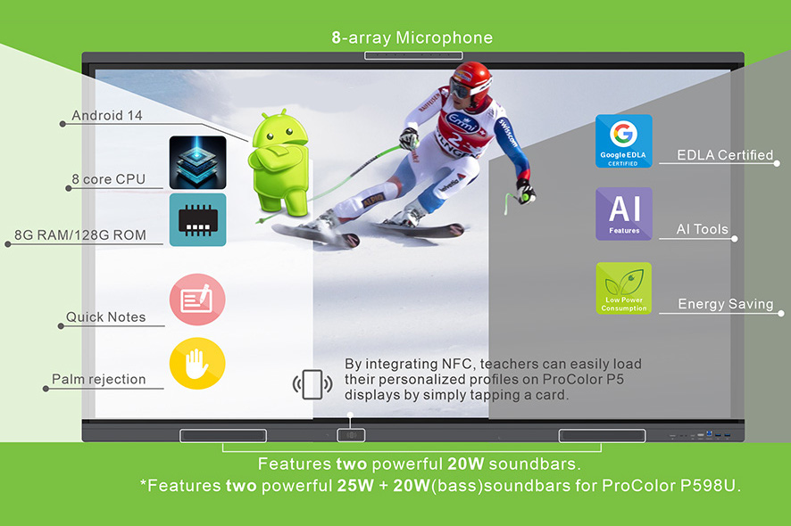The all-new ProColor P5U Series interactive intelligent panel integrates cutting-edge technology and AI-powered tools to create a seamless digital teaching and meeting experience. Powered by Android 14 with an 8-core CPU and 8GB RAM, smooth performance is assured. With 128GB ROM, it provides ample storage space to meet various application needs.